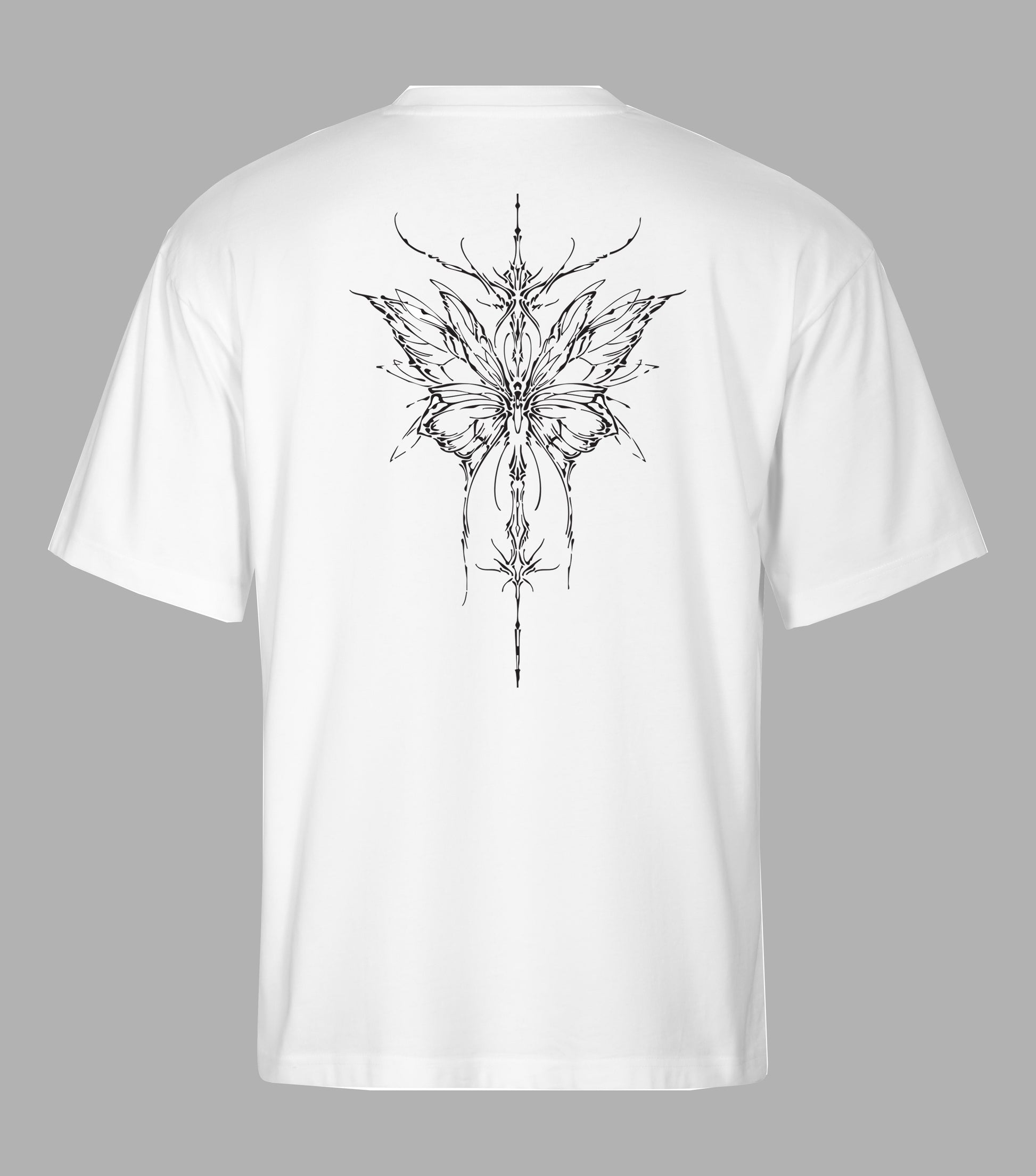 🦋 Design: Abstrakcyjny motyl o ostrych, płynnych liniach, przypominających rozpryski tuszu. Symetria i chaos spotykają się w jednej formie, tworząc obraz pełen napięcia i symboliki. Czerń i biel nadają całości graficzny, niemal tatuażowy charakter.
