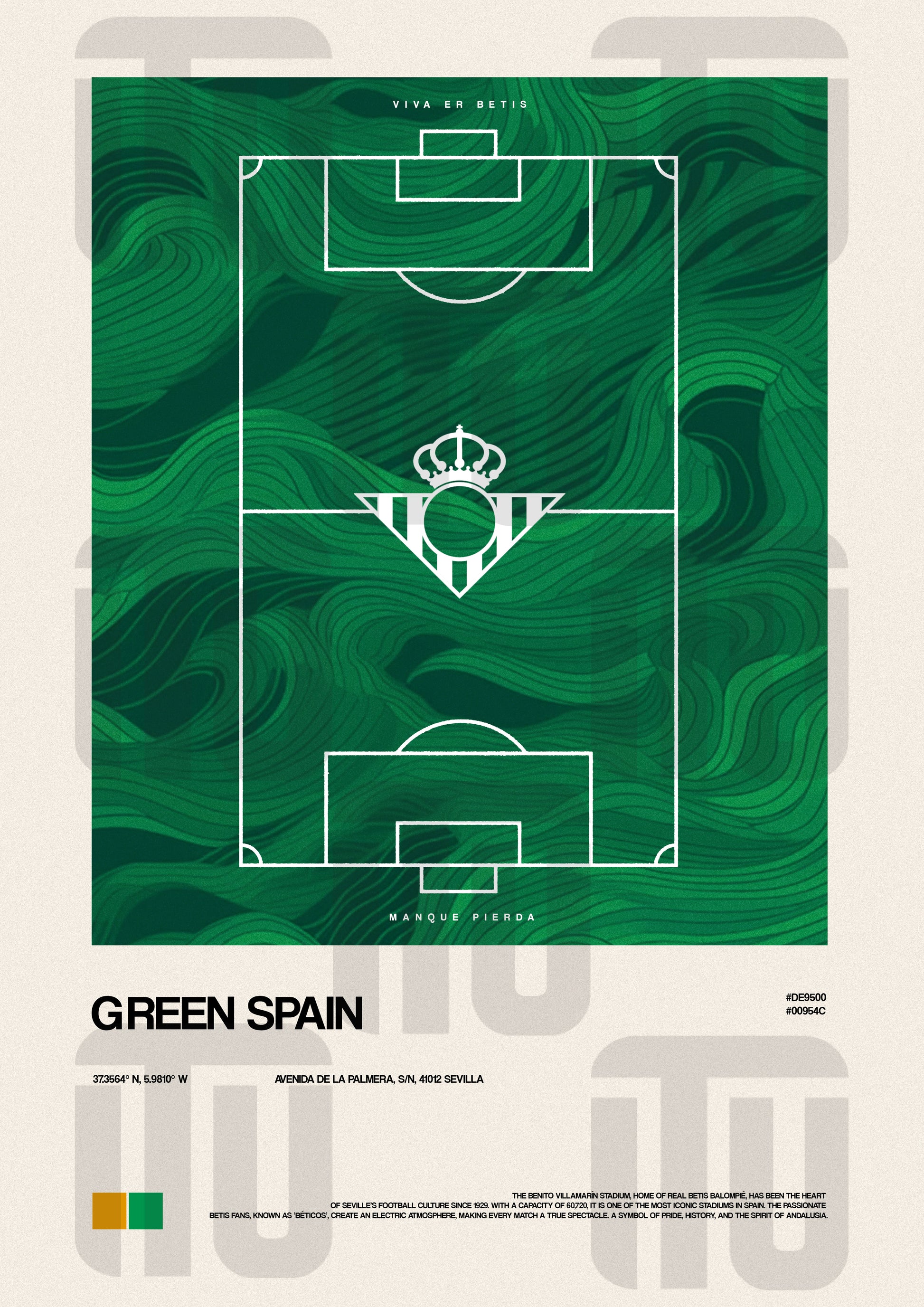 Miejsce pełne pasji, śpiewu i niepowtarzalnego klimatu. Obraz „Zieleń Sewilli – Głos Południa” to graficzna interpretacja stadionu, który tętni życiem w rytmie południowego słońca. Dynamiczne, zielone tonacje, strukturalne linie i symboliczna murawa oddają ducha klubu zakorzenionego głęboko w sercu Andaluzji.