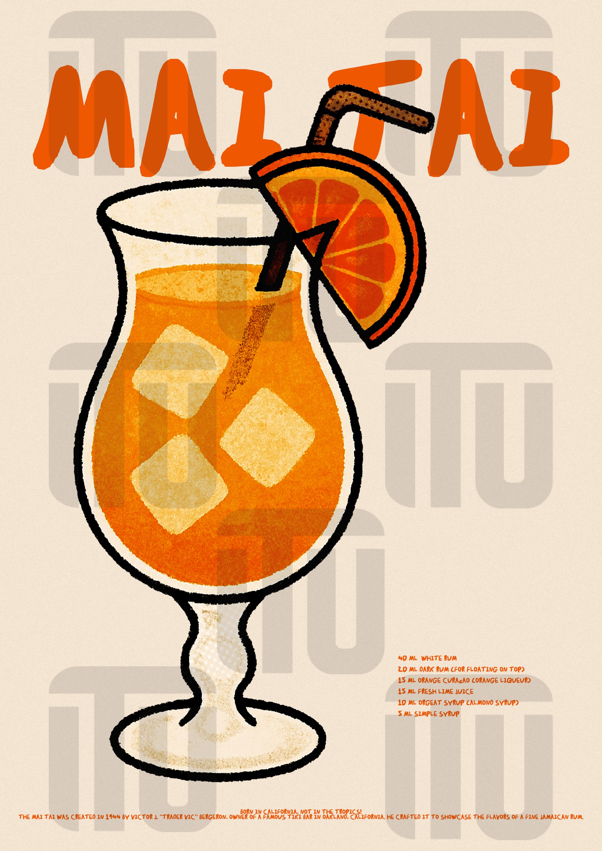 🍹 Design: Ręcznie stylizowana grafika kieliszka z drinkiem Mai Tai, z charakterystyczną ozdobą z plastra cytrusa i słomką. Ciepłe kolory i wyraźna linia nadają całości energetycznego, a zarazem eleganckiego charakteru.