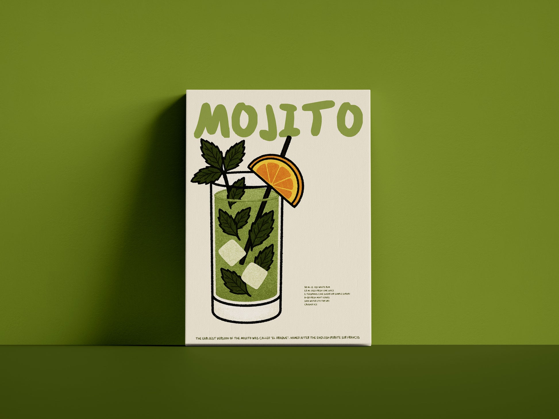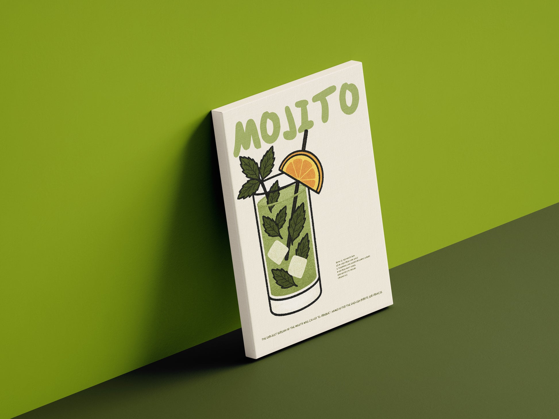 🌿 Design: Ilustracja inspirowana klasycznym Mojito – szklanka z lodem, limonką i miętą w stylizowanej, nowoczesnej grafice. Zielona tonacja przywołuje skojarzenia z latem i orzeźwieniem. Obraz świetnie odnajduje się we wnętrzach w stylu urban jungle, retro lub skandynawskim.