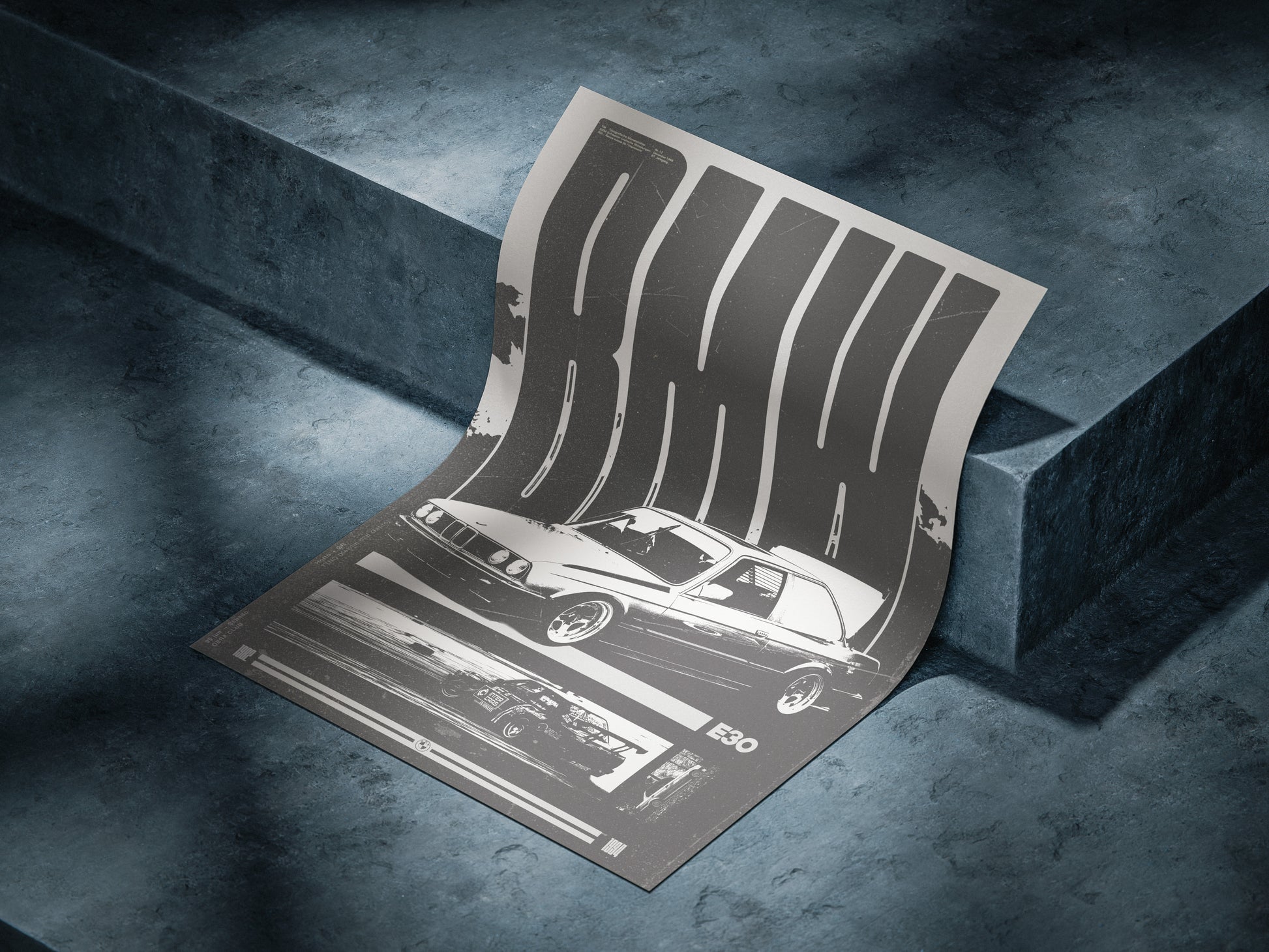 🚗 Design: Legendarne BMW E30 w stylu retro, w połączeniu z dynamicznymi detalami i subtelnymi teksturami, nadającymi plakatowi vintage’owego charakteru.