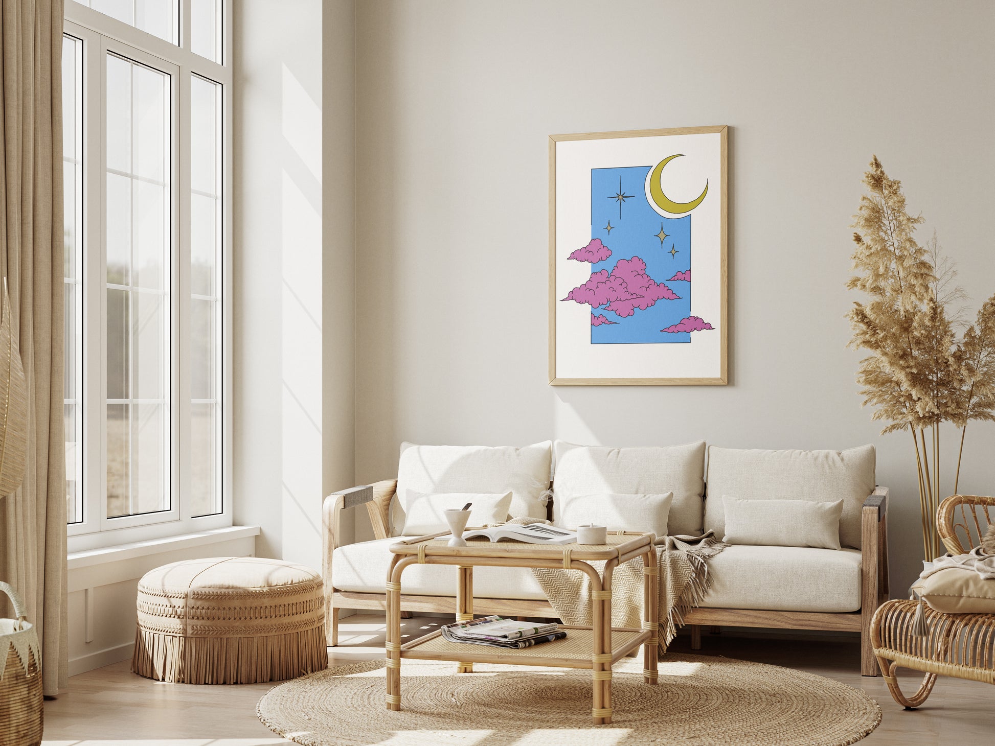 Plakat emanuje spokojem i nostalgią, przynosząc na myśl letnie noce, sny i przestrzeń do refleksji. Idealnie wpisze się we wnętrza w stylu japandi, skandynawskim lub soft minimal – dodając im głębi i atmosfery.