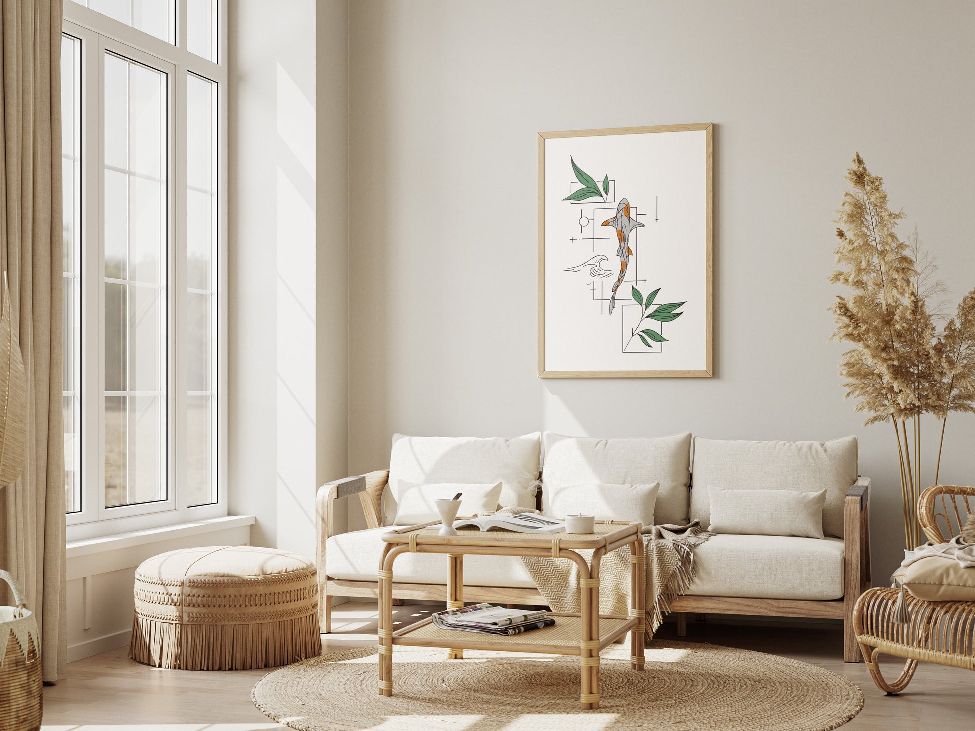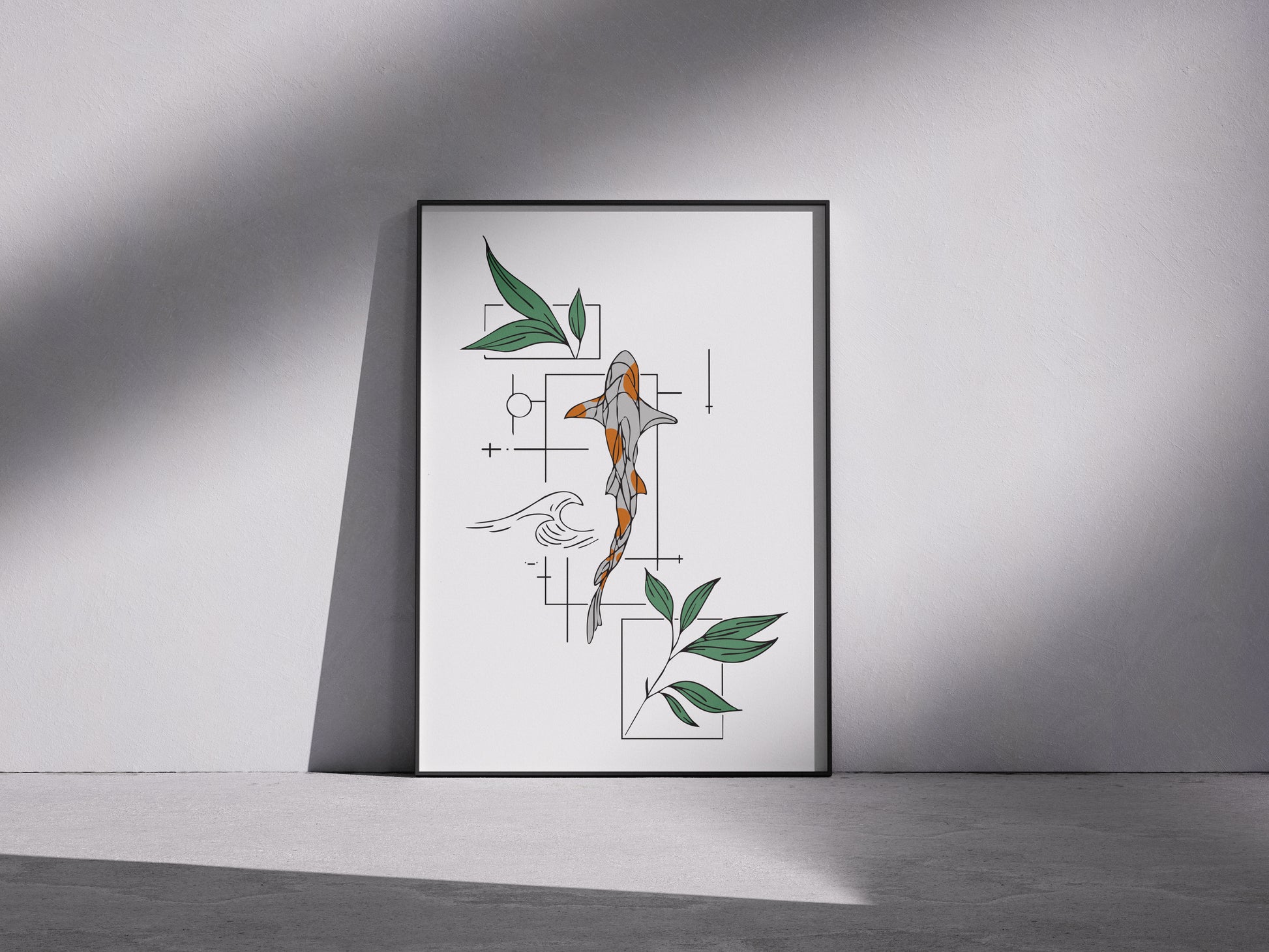 Ożyw swoją przestrzeń wyjątkowym plakatem „GeKoi”, który łączy w sobie delikatność japońskiej estetyki z nowoczesnym, geometrycznym stylem. Centralnym elementem kompozycji jest koi – symbol siły, wytrwałości i wewnętrznej równowagi – otoczony minimalistycznymi liniami i organicznymi liśćmi w odcieniach butelkowej zieleni.