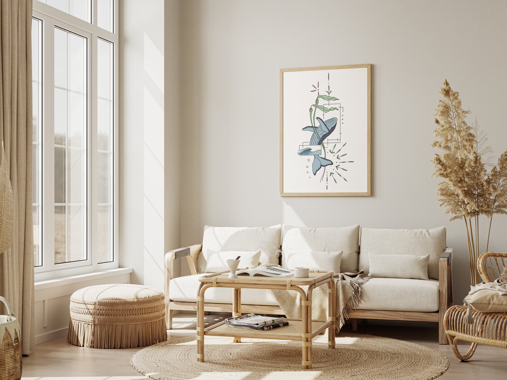 Wieloryb symbolizuje siłę, wolność i mądrość – jego obecność w Twojej przestrzeni może stać się źródłem codziennej inspiracji i wyciszenia. Kompozycja świetnie uzupełni wnętrza urządzone w stylu japandi, nowoczesnym lub boho minimalistycznym.