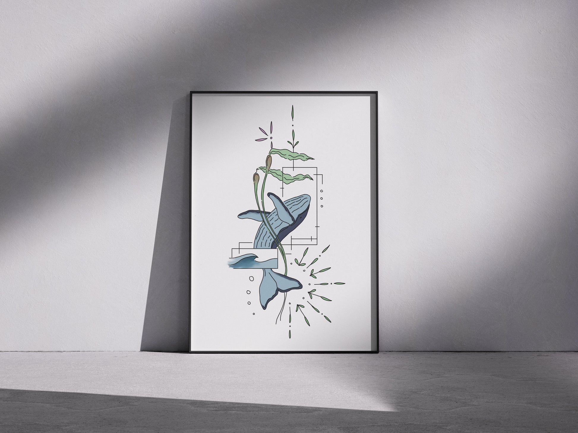 Wprowadź do swojego wnętrza spokój oceanicznych głębin z plakatem „Flipale” – połączeniem majestatu natury i nowoczesnej estetyki. Centralny motyw to sylwetka wieloryba, zakomponowana z finezyjnych linii i delikatnych, organicznych kształtów w stonowanych odcieniach zieleni i beżu.