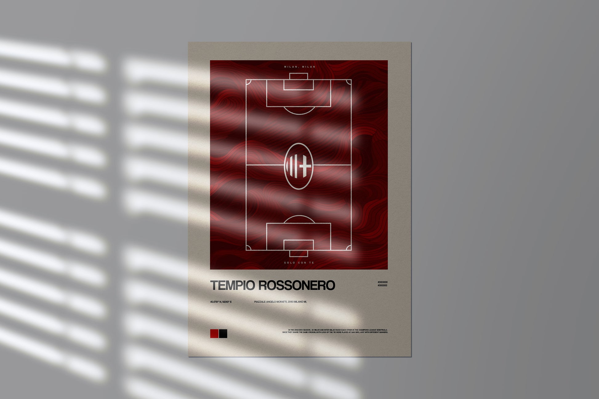 🏟️ Design: Abstrakcyjna wizja stadionu z lotu ptaka, z wyraźnie zaznaczoną murawą i rytmiczną strukturą trybun. Kolory inspirowane barwami legendarnego klubu z Mediolanu, które nadają przestrzeni energii i wyrazistości.