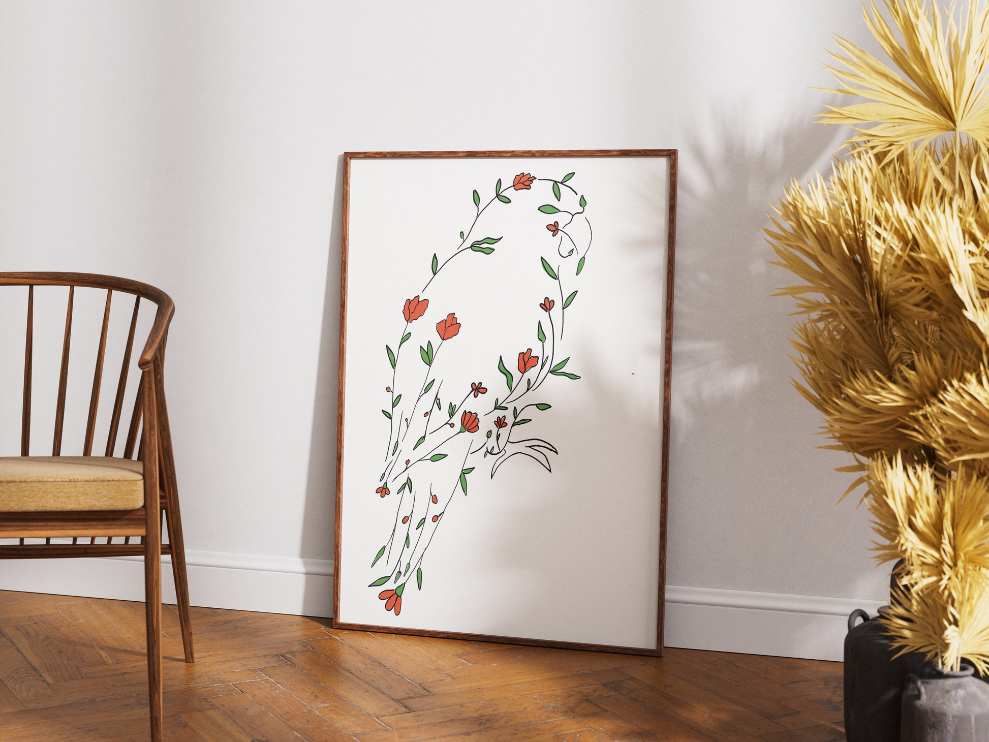🦜 Design: Sylwetka papugi zbudowana z kwiatowych i roślinnych form – zrównoważona kompozycja pełna lekkości, koloru i egzotycznego uroku. Ilustracja łączy delikatność line artu z dekoracyjną mocą przyrody.