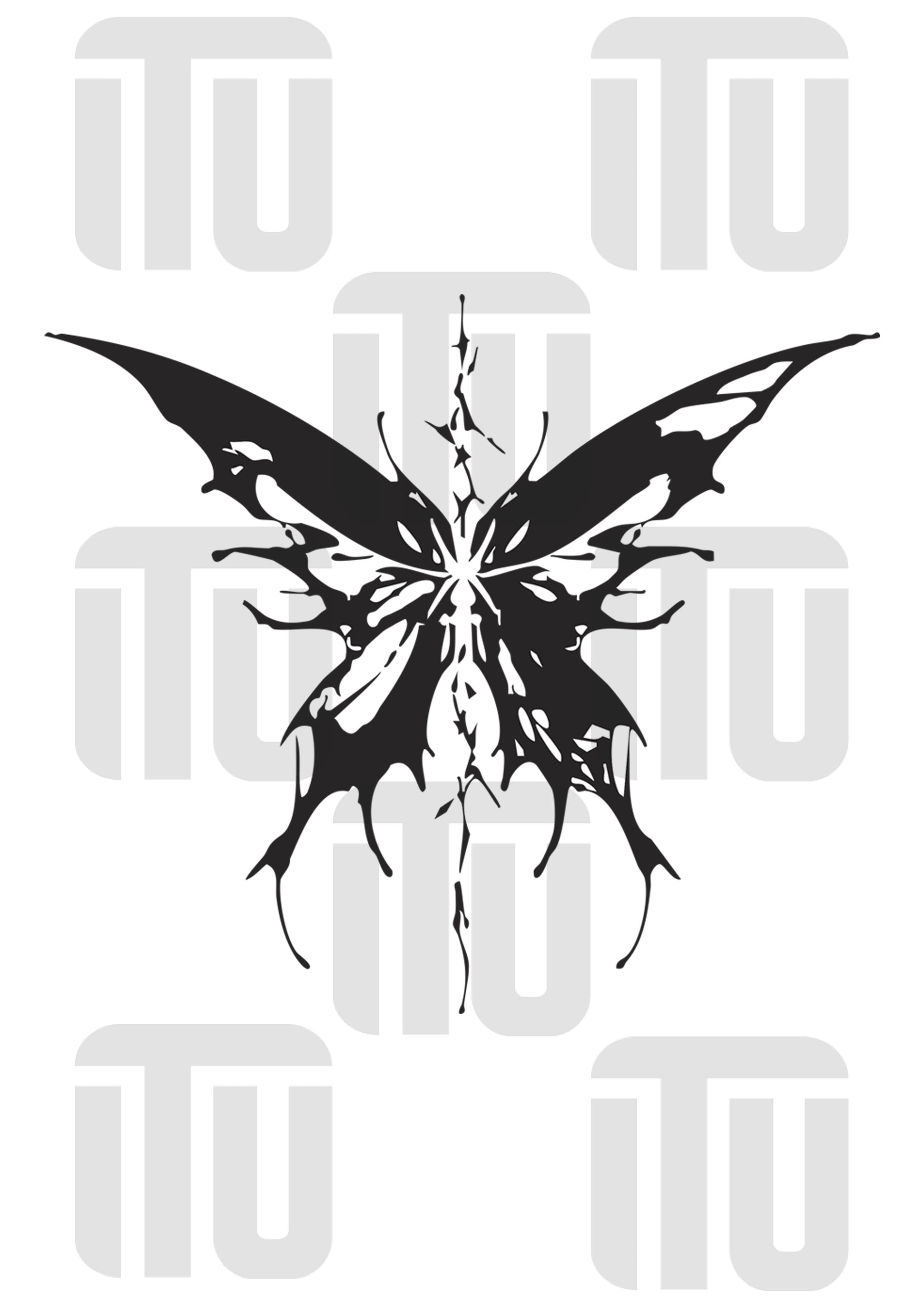 🦋 Design: Abstrakcyjny motyl o ostrych, płynnych liniach, przypominających rozpryski tuszu. Symetria i chaos spotykają się w jednej formie, tworząc obraz pełen napięcia i symboliki. Czerń i biel nadają całości graficzny, niemal tatuażowy charakter.