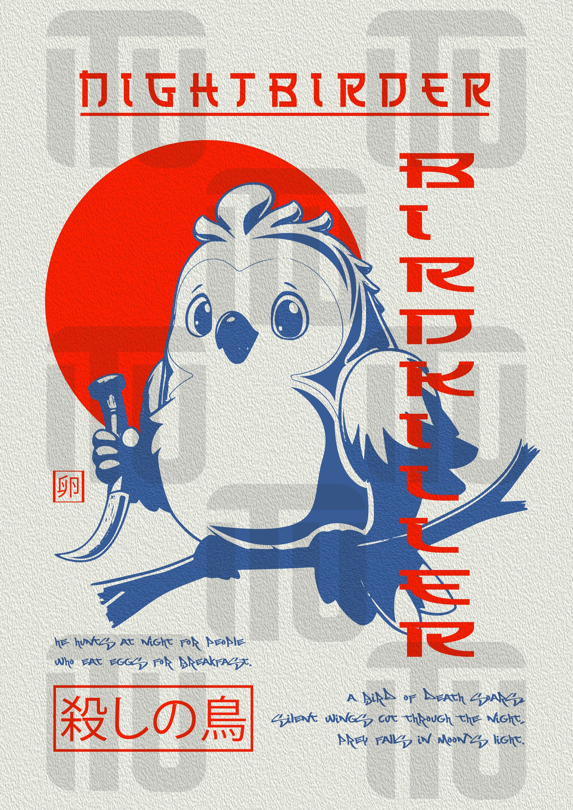 🎨 Design: Czerwono-granatowa grafika z subtelną fakturą tła i wyrazistym czerwonym słońcem w tle. Uzbrojony ptaszek z ostrzem w skrzydle to bohater, który woli noc niż śpiew o poranku – i nie waha się go użyć! Perfekcyjny element wystroju dla każdego, kto lubi klimat „kawaii z pazurem”.